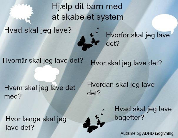 Vil du hjælpe dit barn på vej, må du skabe et system for dit barn. Det gør du ved at give ham svar på så mange hv – spørgsmål som muligt. Det kan gøres visuelt ved hjælp af bla. piktogrammer eller ved hjælp af tekst i form af et dagskema.